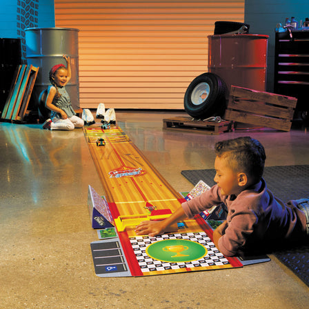 Create your own bowling alley at home. Set the pins at the end of the track and see who can knock 'em all down first.