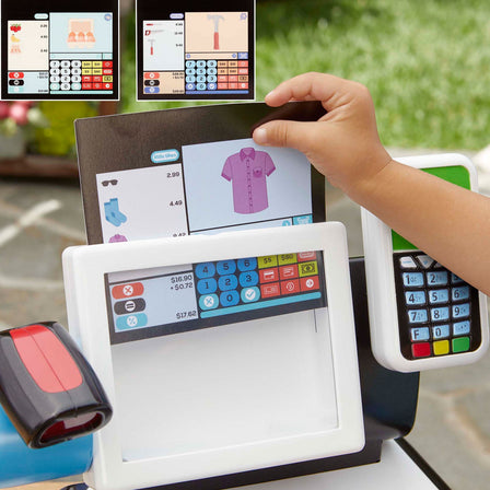 Kids can choose between three screens while they play: grocery, hardware, or clothing store.